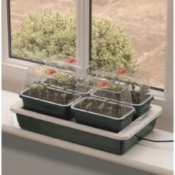 Designed for the keen gardener looking to grow a range of seed varieties. The size of the electric heated base lends itself to use on a windowsill or on a spare room table top. Featuring 4 independent mini vented propagators which allow for added user flexibility, each 17cm (6.75″) Long by 10cm (4″) Wide. The heated base contains a 8 Watt carbon fibre element for even heat distribution. This unit is not thermostatically controlled and is designed to increase the ambient compost temperature by around 8° Centigrade.