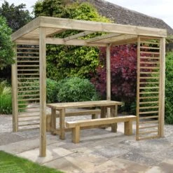 The Dining Pergola from Forest is a stylish, contemporary design that will create a stunning feature in your garden. It’s the perfect spot to eat and entertain. The laddered side and roof panels add an extra dimension to the structure and are fantastic for training climbing plants and creating your own shade.