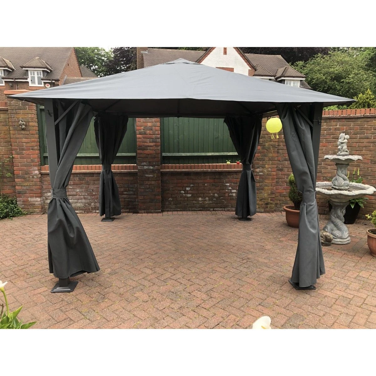 Strong and stylish, the Highfield gazebo from Glendale offers unrivalled durability from a fabric roofed gazebo. Using a heavy gauge 280grm PVC lined, waterproof polyester, the Highfield is a true all weather gazebo for the garden. Durable 3” square steel columns and large heavy duty fixing plates ensure the gazebo stays secure once positioned. Finished in a hammered grey frame with complementing coloured curtains, makes this an elegant addition to any garden.