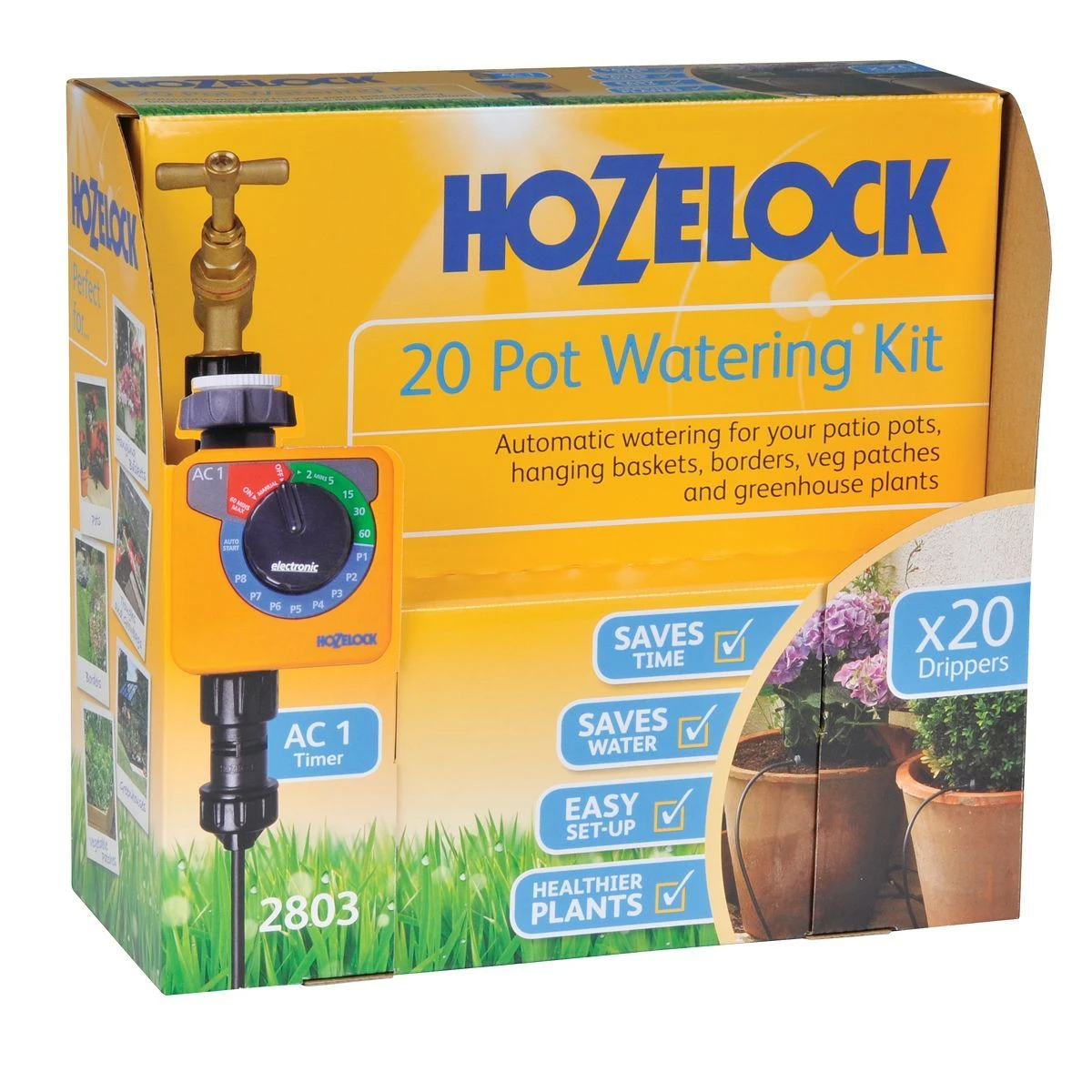 The Hozelock Auto Kit 20, available from Notcutts, contains an AC1 timer plus pressure reducer, 15mx4mm micro tube, 20x4lph drippers and stakes, 19x4mm tee connectors, 5x4mm wall clips, 5xtube adapters, 2x4mm adaptors.
