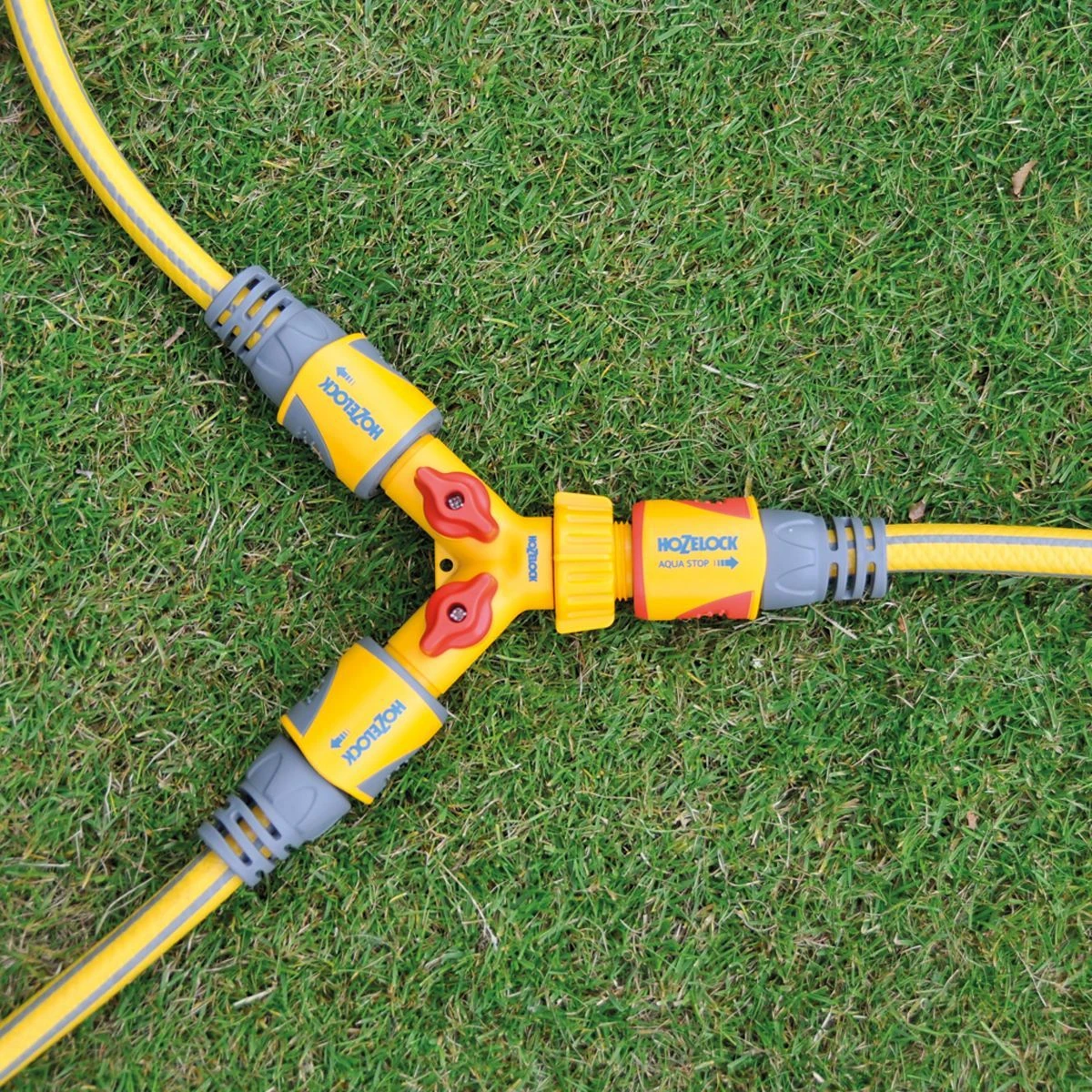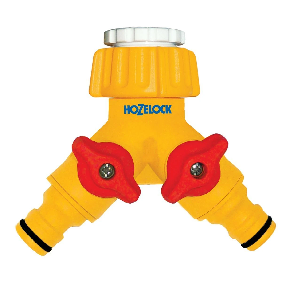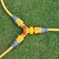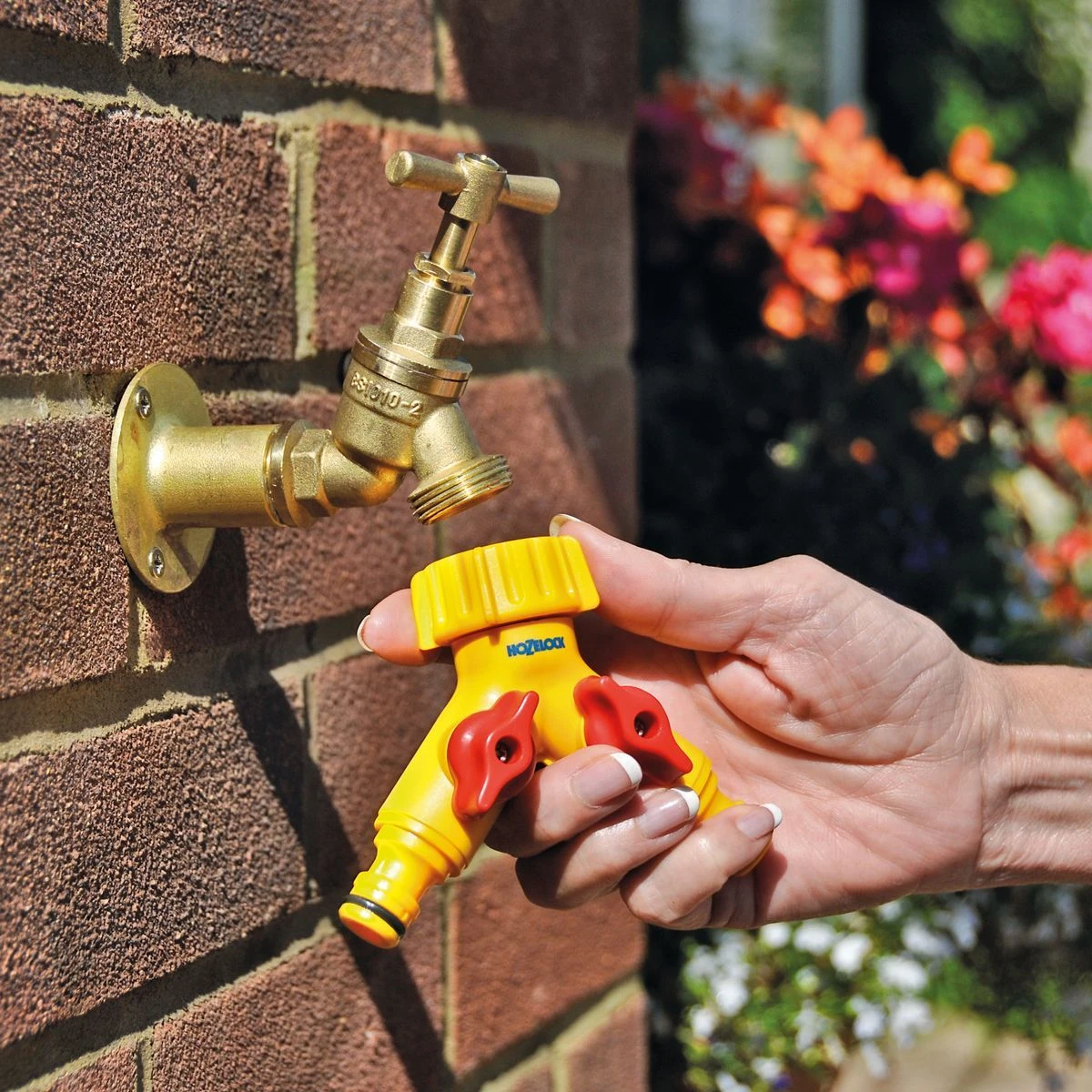 The Hozelock Dual Tap Connector, available at Notcutts, Allows two hoses to be connected to the same tap. One or both can be selected or the water can be turned off.