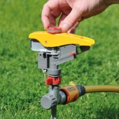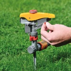 The Hozelock Pulsating Sprinkler, available from Notcutts, is a traditional sprinkler with a metal ground spike and impact-resistant components for durability.