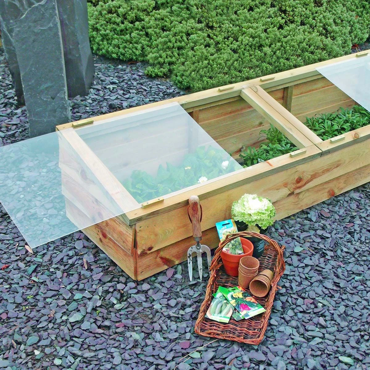 Extend the growing season and protect your plants or seedlings during the colder weather. The Large Cold Frame has plenty of insulation to protect against frost, as well as glazing panels that help maintain an even temperature. The two adjustable lids provide easy access to tend your plants or crops. A sleeper frame version of this product is also available.