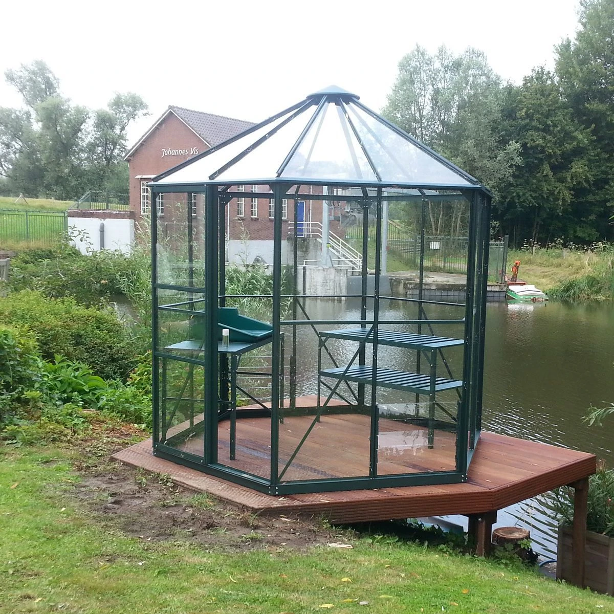 The perfect greenhouse can be a lovely addition to any garden, and the Vitavia Hera Greenhouse is a particularly attractive and eye-catching structure that could enhance your garden and easily become the focal point of any outdoor space. This unusual, multi-sided greenhouse is available in a choice of 2 sizes, both of which offer a large amount of growing space, or indeed leisure space. The Vitavia Hera Greenhouse also has a generous eaves height, making this model a great choice for the taller gardener. Like many other greenhouses in our range, this model comes with either powder-coated green aluminium profiles or anodised aluminium profiles. The process of anodisation keeps the aluminium looking good as new to ensure that your greenhouse continues to enhance the look of your garden for many years to come, with minimal maintenance required.