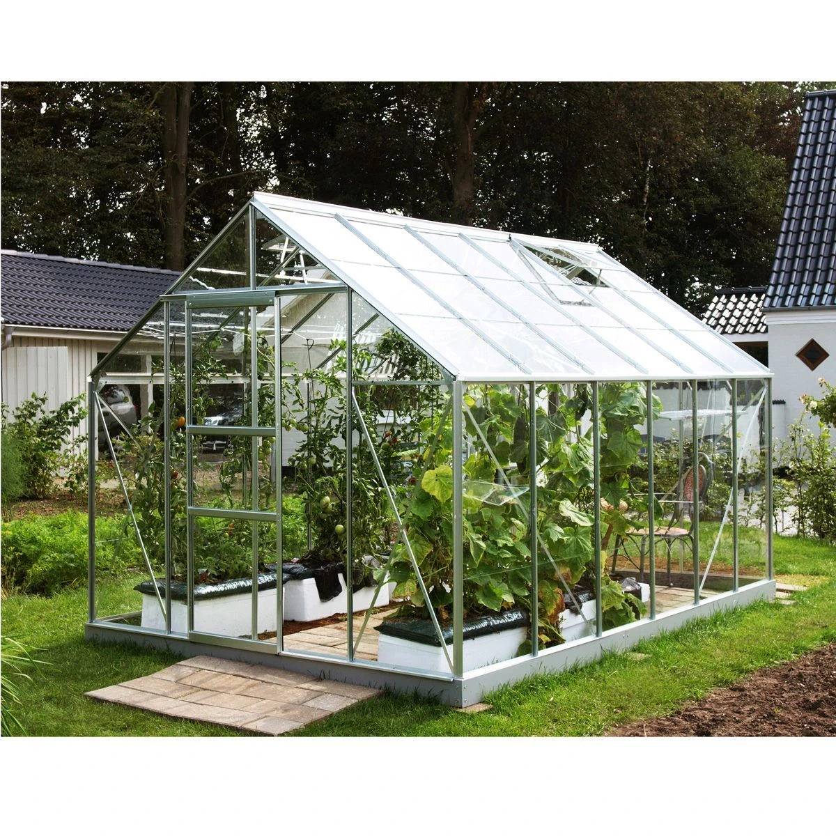 The perfect greenhouse is a valuable addition to any garden, providing you with an excellent way to start your seeds and cuttings early in the year, or even grow more exotic and vulnerable plants that may need protection from the variable British weather. The Vitavia Neptune Greenhouse is an attractive and very high-quality greenhouse and has been approved by the TUV Standards Authority. Like many other greenhouses in our range, this model is available in a choice of sizes and comes with either powder-coated green aluminium profiles or anodised aluminium profiles, which are made to last and will help to keep your greenhouse looking great for many years to come