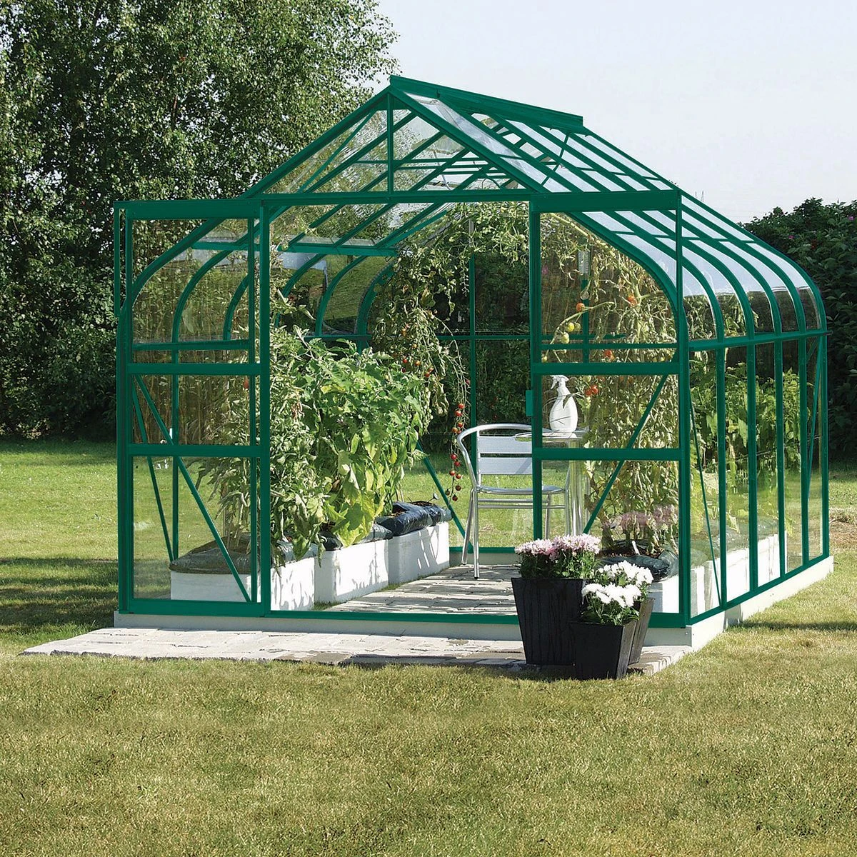 The perfect greenhouse is an attractive feature to add to your garden, not to mention an excellent way to start your seeds and cuttings early in the year, or extend your growing season into the winter. It can also be the perfect place to grow more exotic or vulnerable plants that need a little extra warmth and shelter. The Vitavia Saturn Greenhouse is an attractive and high-quality structure with eye-catching curved eaves. This greenhouse comes in a choice of several different sizes, and you can also choose from durable powder-coated green aluminium profiles, or anodised aluminium, which is known for looking pristine in the long term, with very little maintenance required. This greenhouse has wide double doors that provide easy access and make moving larger items in and out of the greenhouse a breeze.
