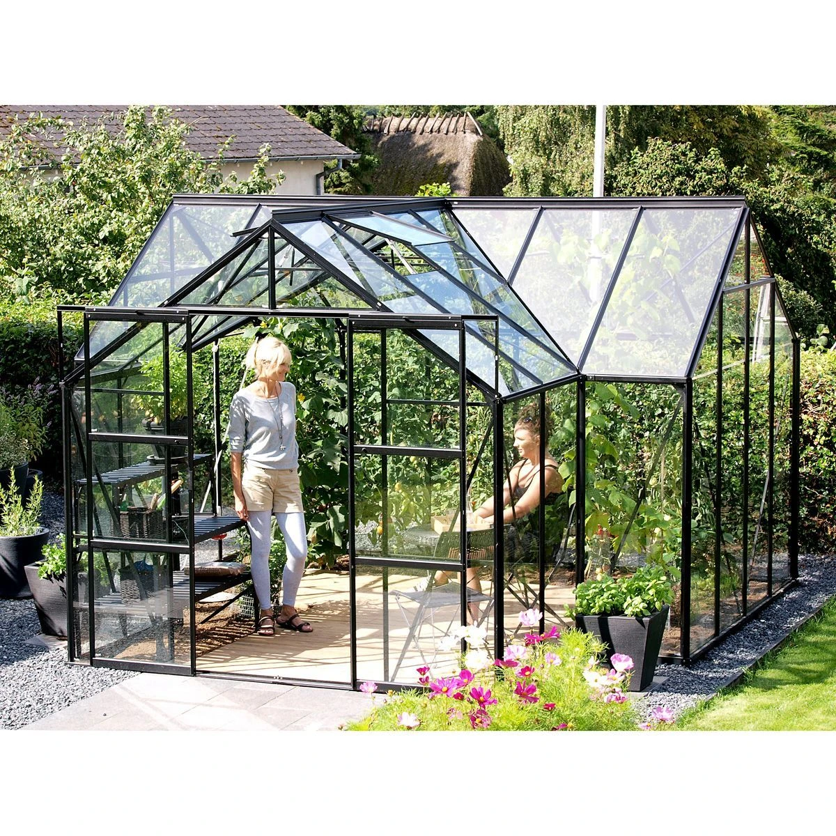 The Vitavia Sirius Greenhouse also comes with 3 downpipes and 4 roof vents, fitted as standard, along with lovely double doors that are very practical and can be opened up to give the structure even more of a feeling of openness. The Sirius model is fitted with single panes of 3mm toughened glass, which are held safely and securely in place with our black rubber capping system, and provide excellent protection from the elements. This distinctive, spacious and high-quality greenhouse is just perfect, whether you want to extend your growing season, grow exotic plants, or create a gorgeous, sheltered, sunny spot that can help you and your family enjoy your garden, all year round.